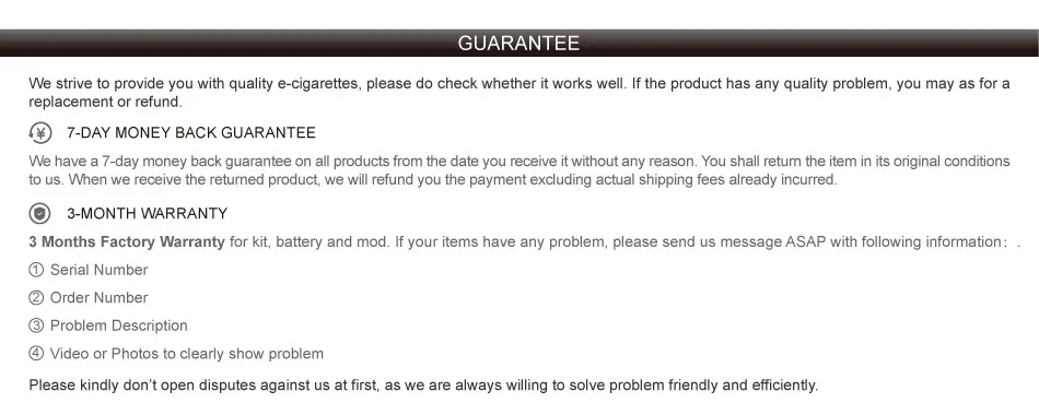 4. If you find that the product does not work properly upon receipt, please contact us immediately. If the product still fails to function after we guide you through its usage, or if we confirm there is indeed a quality issue, we will not hesitate to take responsibility. We will proceed with a refund or resend a replacement by our cost based on mutual agreement.